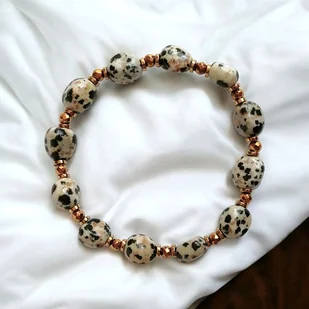 Bransoletka na solidnej gumce jubilerskiej - wykonana z połączenia jaspisu dalmatyńskiego (nieregularne, polerowane bryłki - wielkość ok. 10-12mm) ,oraz licznych przekładek ze złotego hematytu. BRAK ELEMENT ...