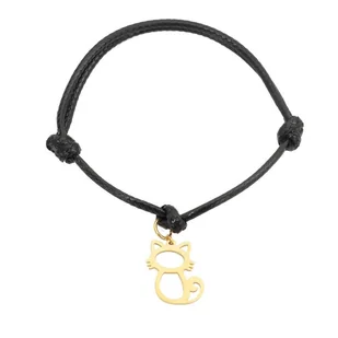 Bransoletka wykonana z wysokiej jakości powlekanego sznurka jubilerskiego, z zawieszką charms - kotem z pozłacanej stali chirurgicznej ( zawieszka ma wymiary ok. 1,7 x 1,4 cm ). Stal jest wyjątkowo trwałym i nie powodującym uczuleń materiałem. Rozmiar uniwersalny - zmieniamy pociągając za węzełki. Końcówki i węzełki starannie zabezpieczone przed i rozwiązaniem się i strzępieniem. Na życzenie sznurek w innym kolorze.