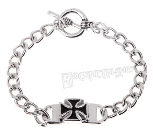 Metalowa bransoletka z elementem krzyż maltański. Wymiary zawieszki: szerokość: 3 cm. grubość: 1,3 cm. Bransoleta: długość około 20 cm. grubość około 0,7 cm.