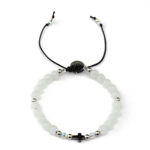 Mleczne szklane koraliki umieszczone na cieniutkim sznurku. Między nimi znajduje się maleńki hematytowy krzyż. ✔️ Na nadgarstek: 15-17cm Rozmiar 15-17cm ozna...