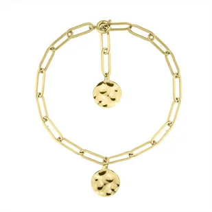 Bransoletka damska - łańcuch o modnych, płaskich, prostokątnych ogniwach. Zdobiona subtelnymi medalionami o ciekawej strukturze. Możliwość zapięcia bransoletki w dowolnym miejscu. Wykonana z hipoalergicznej stali szlachetnej, pozłacanej trwałą metodą PVD. Pasuje do każdej stylizacji, zarówno tej do biura, jak i na elegancką kolację.