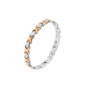 Bransoletka ze stali chirurgicznej / stali jubilerskiej z magnesami, w ozdobnym pudełku Bransoletka ze stali jubilerskiej złożona z lśniących ogniw w złotym kolorze w kształcie litery "X", które przeplatają się z grawerowanymi owalami przypominającymi listki. Wewnętrzna strona bransoletki ma wprasowane magnesy. Bransoletka zapakowana jest w eleganckie pudełko prezentowe, pokryte czerwonym welurem. wymiary bransoletki: 21 x 0,6 cm (długość / szerokość) ilość magnesów: