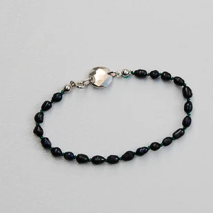 Delikatna bransoletka z 22 naturalnych czarnych pereł supełkowanych na jedwabnej zielonej nici oraz srebrnego madalionu. Wykonana ze srebra próby 925 w matowym fasetowanym wykończeniu oraz pokryta rod ...