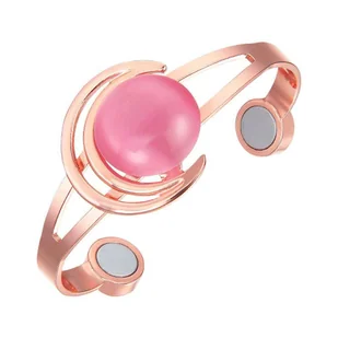 Bransoletka miedziana damska magnetyczna z różowym kamieniem Bransoletka damska z różowym kamieniem – subtelny akcent w eleganckiej oprawie Stworzona dla kobiet, które cenią delikatne formy, harmonijny design i biżuterię podkreślającą ich styl. Ta bransoletka łączy nowoczesną, otwartą konstrukcję z dekoracyjnym różowym kamieniem osadzonym w ozdobnej oprawie. Minimalistyczna forma spotyka się tu z wyrazistym detalem, tworząc kompozycję, która przyciąga uwagę, a jednocześnie pozostaje lekka i kobieca. Design i forma Centralnym punktem bransoletki jest gładki, różowy kamień syntetyczny o subtelnym, mlecznym wykończeniu. Otacza go dekoracyjna oprawa o płynnych liniach, które nadają całości miękkości i elegancji.