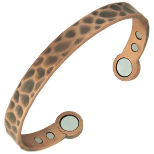 Bransoletka miedziana damska magnetyczna zdrowotna Magnetyczna damska miedziana bransoletka wykonana z czystej miedzi. Bardzo ciekawy i estetyczny wzór. Będzie idealnym dodatkiem do eleganckiej stylizacji. Przednia część bransoletki o niespotykanej nierównomiernej strukturze. Bransoletka miedziana oprócz właściwości ozdobnych posiada również właściwości zdrowotne oraz uzupełnia braki tego metalu w organizmie.