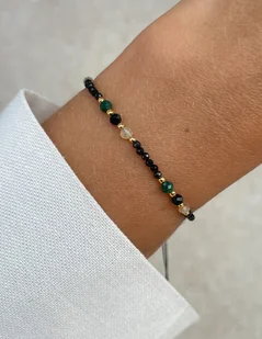 Bransoletka z czarnym turmalinem, malachitem i cytrynem z pozłacanymi kulkami ze srebra próby 925 Wielkość kamieni czarny turmalin: ok. 2mm, 3 mm Wielkość kamieni cytryn: ok. 3 mm Wielkość kamieni malachit ...