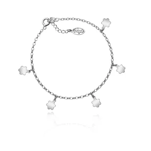 Bransoletka srebrna na nogę próby 925. Wykonana z łańcuszka typu rolo z zawieszkami kwiatuszkami. Bransoletka jest zakończona przedłużką z metką. Stwórz biżu...