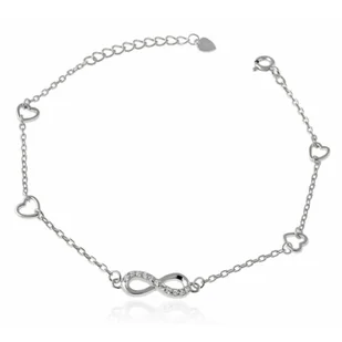 Bransoletka nieskończoność ósemka z sercami srebro 925 Symbol miłości Opis produktu: Delikatna bransoletka wykonana ze srebra próby 925, ozdobiona symbolem nieskończoności wysadzanym drobnymi, błyszczącymi kamieniami. Dodatkowo wplecione w łańcuszek cztery serca nadają całości romantycznego charakteru. Regulowane zapięcie zakończone zawieszką w kształcie serca pozwala dopasować długość do nadgarstka. Motyw nieskończoności symbolizuje wieczną miłość, trwałą więź i nieprzemijające uczucia.