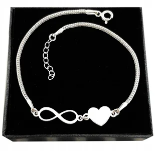 Bransoletka z nieskończonością i serduszkiem (z dowolnym grawerem) w całości wykonana ze srebra 925 , zapakowana w ozdobne pudełeczko. Bransoletka GWIAZD CELEBRYTKA dwie zawieszki infinity i serduszko w bardzo eleganckiej formie na szerokiej taśmie. Długość bransoletki: ok 18 cm + regulacja (2,3cm) Średnica łańcuszka 2,5mm Wykonanie: srebro najwyższej próby 925 Bransoletka jest jakościowym wyrobem jubilerskim.