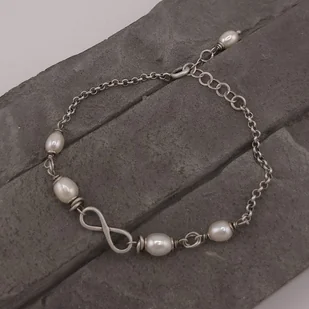 Kobieca, subtelna bransoletka na co dzień z motywem nieskończoności. Wykonana w całości ze srebra próby 925 oraz pereł słodkowodnych wielkosci 6 i 5 mm. Całkowita długość bransoletki regulowana 17,5 - 20 cm. Oz ...