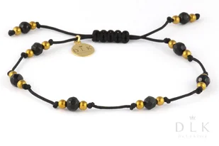 Bransoletka „Onyks ze złotym hematytem na czarnym sznurku” to lekka, bardzo kobieca propozycja z kolekcji bransoletek sznureczkowych. Jej wyjątkowość tkwi w niezobowiązującym charakterze i skromnej, ale eleganckiej formie. Bransoletka wykonana jest z czarnych, fasetowanych kulek onyksu umieszczonych pomiędzy złotymi kulkami hematytu na czarnym sznurku. Onyks, cenna odmiana agatu, jest rzadkim minerałem spotykanym w skałach wulkanicznych. Hematyt (gr. haema (haima), krew; haimatites, krwisty; w nawiązaniu do czerwonej barwy tego minerału po jego sproszkowaniu) – minerał pospolity, tlenek żelaza.
