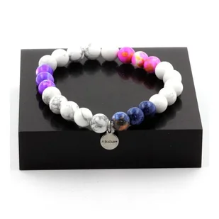 Bransoletka Perły, Howlit + Jaspis fioletowy niebieski + Jaspis różowy żółty + Jaspis niebieski o średnicy 8 mm. Długość 19-20 cm. Dostarczana w etui. Wyprodukowana we Francji w pracowni A Bijoux. Ref. : SKU049703. Biżuteria zazwyczaj wykonana z metalu szlachetnego lub ozdobiona kamieniami szlachetnymi lub półszlachetnymi.