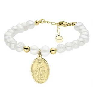 Wyjątkowa bransoletka z pereł hodowlanych oraz stali szlachetnej z medalikiem przedstawiającym wizerunek Matki Boskiej. Pozłacana trwałą, odporną na ścieranie metodą PVD, która nadaje piękny kolor 14k złota. Biżuteria z motywem sakralnym uzupełni stylizacje codzienne, jak i te na ważne okazje. Perły są symbolem piękna, doskonałości oraz skromności, nazywane często "łzami aniołów". Zapewniają bezpieczeństwo oraz chronią przed niepowodzeniami.