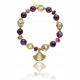 Bransoletka Lovely Stones z ametystami i kwarcem Zanurz się w kojącym uroku natury. Ta niezwykła bransoletka łączy w sobie magiczny ametyst, delikatny kwarc i czysty kryształ górski, tworząc kompozycję pełną elegancji i pozytywnej energii. Ametyst – o głębokim, fioletowym kolorze – od wieków uznawany jest za kamień równowagi, intuicji i wewnętrznego spokoju. W zestawieniu z kryształem górskim symbolizuje czystość i siłę ducha, a kremowy kwarc dodaje całości delikatności i kobiecego wdzięku. Bransoletkę zdobi zawieszka w kształcie liścia miłorzębu – symbolu długowieczności i odrodzenia, w której został zatopiony subtelny kremowy kamień kwarcu.