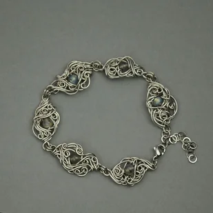 Ręcznie robiona bransoletka z pięknymi, połyskującymi na kolorowo labradorytami. Wykonana techniką wire wrapping z drutów ze stali chirurgicznej. Długość bransoletki regulowana 18-22 cm. Bransoletka jest uni ...