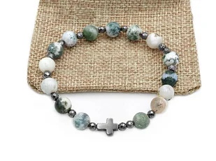 Materiał: gumka jubilerska Kamień: agat mszysty, hematyt (kule gładkie lub fasetowany zależne od dostępności) Średnica koralików: 8 mm Obwód bransoletki (wewnątrz): 16,5 cm Rozmiar uniwersalny: pasuje do nadgarstka 15,5 - 17 cm Całkowita waga bransoletki: