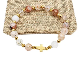 Materiał: gumka jubilerska Kamień: kwarc z rutylem Średnica kamieni: 8,4 mm Obwód bransoletki (wewnątrz): 17 cm Rozmiar uniwersalny: pasuje do nadgarstka 16,...