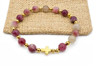 Materiał: gumka jubilerska Kamień: kamień naturalny różowy turmalin rubelit, złoty hematyt (kule gładkie lub fasetowany zależne od dostępności) Średnica turmalinów: ~ 8,1 mm Obwód bransoletki (wewnątrz): 17 cm Rozmiar uniwersalny: pasuje do nadgarstka 15,5 - 17 cm Zapakowany w jutowy woreczek zaciągany z obu stron sznurkiem