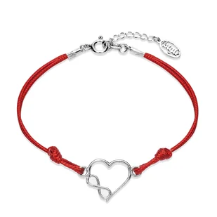 Bransoletka srebrna próby 925 wykonana na sznurku jubilerskim w kolorze czerwonym z serduszkiem ze znakiem nieskończoności - infinity. Bransoletka zakończona...