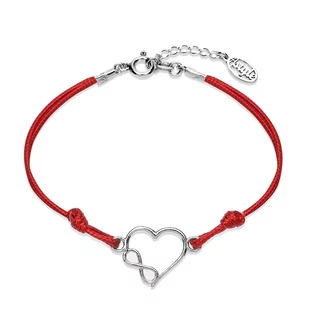 Bransoletka srebrna próby 925 wykonana na sznurku jubilerskim w kolorze czerwonym z serduszkiem ze znakiem nieskończoności - infinity. Bransoletka zakończona...
