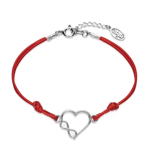 Bransoletka srebrna próby 925 wykonana na sznurku jubilerskim w kolorze czerwonym z serduszkiem ze znakiem nieskończoności - infinity. Bransoletka zakończona jest przedłużką z metką. Stwórz biżuterię na zamówienie jaką lubisz i wybierz z dostępnych opcji: złocenie, złocenie różowe, rodowanie, rodowanie czarne lub mieszaj kolory w dowolny sposób, np. zapięcie i przedłużka-złocenie, serduszko-złocenie różowe.