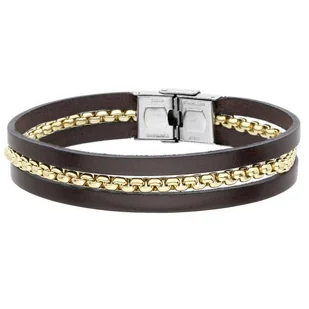 Bransoletka wykonana z brązowej skóry naturalnej oraz stali szlachetnej 316L, która jest materiałem hipoalergicznym. Pozłacany, stalowy łańcuszek nadaje jej rockowego charakteru. Jego kolor uzyskano metodą PVD, trwałą i odporną na ścieranie. Będzie niebanalnym i oryginalnym dodatkiem do wielu stylizacji. Materiał: stal szlachetna, skóra naturalnaWymiary: