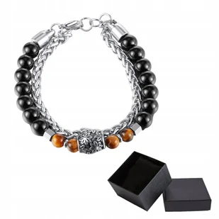 Bransoletka srebrna z łańcuszkiem to elegancki dodatek dla osób ceniących unikalny styl i naturalne materiały. Wykonana z wysokiej jakości stali chirurgicznej 316L, jest odporna na zarysowania oraz nie zawiera niklu, co czyni ją idealnym wyborem dla alergików. Długość bransoletki wynosi 21 cm, a szerokość to 1,2 cm, co zapewnia wygodę noszenia. Zastosowane kamienie naturalne, takie jak czarny agat i tygrysie oko, mają wymiary od 0,6 do 0,8 cm, dodając biżuterii wyjątkowego charakteru. Bransoletka charakteryzuje się uniwersalnym wzornictwem, które doskonale komponuje się z różnorodnymi stylizacjami, zarówno na co dzień, jak i na wyjątkowe okazje.