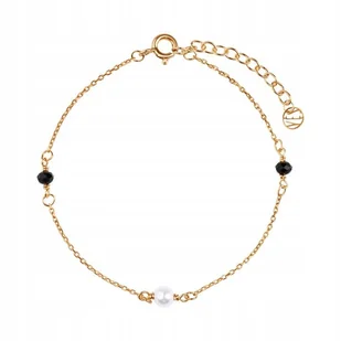 Bransoletka srebrna pozłacana z perłą i czarnym szkłem Kruszec: srebro, pozłacane Próba: 925 Długość regulowana: 16-19 cm Zdobienie: imitacja białej perły oraz czarne szkło Średnia gramatura: