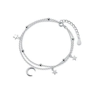 Text Example Bransoletka podwójna (posrebrzana miedź) Motyw: księżyc, gwiazdy, kulki Materiał: posrebrzana miedź Zdobienie: cyrkonie Długość całkowita: 30 cm...