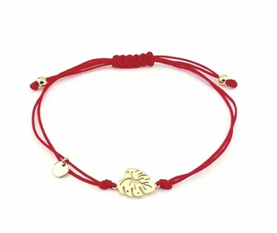 Bransoletka na sznurku koloru czerwonego z pozłacaną zawieszką w kształcie liścia monstera. Pozłacana, bransoletka na czerwonym sznurku to genialny pomysł na...