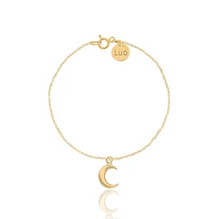 Bransoletka srebrna pozłacana z grawerowanym księżycem. Całość wykonana ze srebra 925 pokrytego 24 karatowym żółtym złotem. Księżyc: 12,5 x 9,1 mm Długość bransoletki: 18 cm Zawieszka logo: 8 mm Grubość łańcuszka: