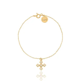 Bransoletka srebrna pozłacana z krzyżykiem wysadzanym kryształkami Preciosa. Całość wykonana ze srebra 925 pokrytego 24 karatowym żółtym złotem. Krzyżyk wysadzany 5 kryształami Preciosa. Krzyżyk: 15,3 x 12,5 mm Długość bransoletki: 18 cm Grubość łańcuszka: