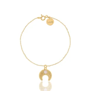 Bransoletka srebrna pozłacana z księżycem i kwarcem różowym. Całość wykonana ze srebra 925 pokrytego 24 karatowym żółtym złotem. Kwarc różowy: średnica 4,0 mm Księżyc / Lunula: 14,4 x 15,0 mm; grubość: