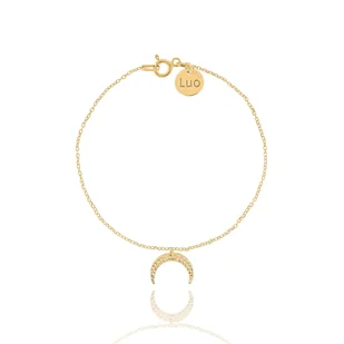 Bransoletka srebrna pozłacana z młotkowanym księżycem. Całość wykonana ze srebra 925 pokrytego 24 karatowym żółtym złotem. Księżyc: 9,4 x 12,6 mm Długość bransoletki: 18 cm Grubość łańcuszka: 1 mm Zawieszka logo: