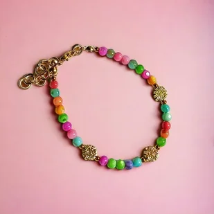 NOWA, LIMITOWANA KOLEKCJA Dostępne zaledwie kilka egzemplarzy! Bransoletka na solidnej lince stalowej (miękkiej) - została wykonana z kolorowej muszli (kuleczki 4mm), przekładek - kwiatuszków ze złot ...