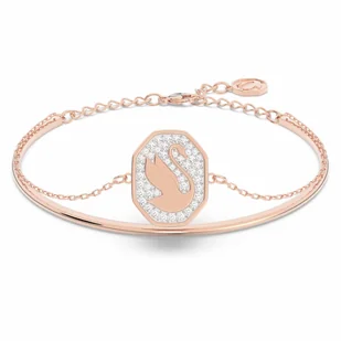 Ta nowoczesna bransoletka typu bangle łączy ze sobą dwa kultowe symbole marki Swarovski: łabędzia i ośmiokąt. Atrakcyjne bezbarwne kryształy, które po mistrzowsku wkomponowano w ten wzór, współgrają z wykończonym powłoką w odcieniu różowego złota łańcuszkiem z regulowanym zapięciem. Można nosić ją jako pojedynczą ozdobę lub w zestawieniu z pasującymi do niej kolczykami i wisiorkiem z rodziny Signum.