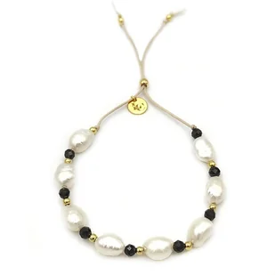 Bransoletka Szachownica na beżowym sznureczku, wykonana z kamieni spinela czarnego oraz z pereł, przeplatanych kuleczkami pozłacanymi 24 karatowym, żółtym złotem. Posiada srebrny (złocony) stoper, który umożliwia regulację do 6cm. Bransoletka świetnie komponuje się z naszyjnikiem, kolczykami i pierścionkiem o tej samej nazwie: Szachownica. Opis Kamieni: