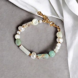 urocza, delikatna bransoletka w odcieniach biel-krem-mięta Wykonana z miksu elementów z pereł, amazonitu, muszli, masy perłowej, jaspisu cesarskiego, oraz drobniutkich kuleczek złotego hematytu 2mm. wszy ...
