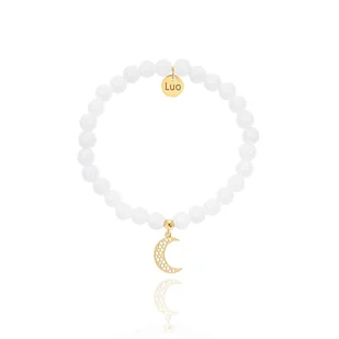 Bransoletka z białego jadeitu ze srebrnym pozłacanym ażurowym księżycem. Zawieszka oraz logo wykonane ze srebra 925 pokrytego 24 karatowym żółtym złotem. Ażurowy księżyc: 15,4 x 10,8 mm Jadeit: 6 mm Długość bransoletki: