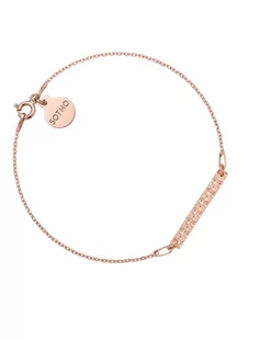 Złota bransoletka łańcuszkowa zdobiona z chropowatą prostokątną blaszką i zawieszką z logo marki. Całość wykonana ze srebra 925 powlekanego 24 karatowym różo...