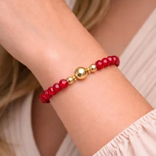 Stylowa bransoletka wykonana z czerwonych koralików, w czterech miejscach przeplatanych złotymi kuleczkami. Intensywna czerwień w połączeniu ze złotym blaskiem tworzy elegancką i przyciągającą uwagę kompozycję. Bransoletka została wykonana na elastycznej gumce, dzięki czemu jest wygodna w noszeniu i łatwo dopasowuje się do nadgarstka. To idealny dodatek do codziennych stylizacji, który doda im koloru i subtelnej elegancji. ✨ Czerwone koraliki i złote kuleczki ✨ Elastyczna gumka - wygodne zakładanie ✨ Lekka i komfortowa w noszeniu ✨ Stylowy dodatek do wielu stylizacji Delikatna biżuteria, która doda stylizacji energii i eleganckiego blasku.