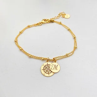 ♡ OPIS Delikatna bransoletka na podwójnym łańcuszku z zawieszką w kompas. Wykonana ze srebra próby 925 pozłacana. Może być personalizowana poprzez dodanie zawieszki z literką. ♡ DETALE Kruszec: srebro próby ...