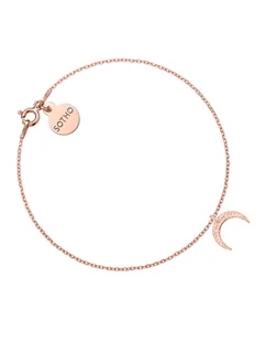 Złota bransoletka łańcuszkowa zdobiona księżycem i zawieszką z logo marki. Całość wykonana ze srebra 925 powlekanego 24 karatowym różowy złotem. Długość 18 cm. Grubość łańcuszka 1 mm. Księżyc 9,4 x 12,6 mm Zawieszka z ...