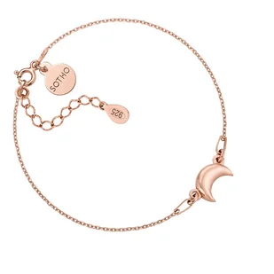 Złota bransoletka z księżycem i zawieszką z logo marki. Całość wykonana ze srebra 925 powlekanego 24 karatowym różowym złotem. Długość bransoletki ok. 16,5 cm plus ok. 3,8 cm przedłużki Grubość łańcuszka 1 mm K ...