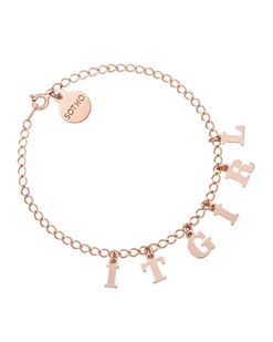 Złota bransoletka zdobiona zawieszkami (literki i cyferki) i logo marki. Całość wykonana ze srebra 925 powlekanego 24 karatowym różowym złotem. Baza bransole...