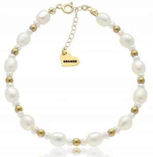 Złota efektowna bransoleta z pereł Bransoletka wykonana ze srebra pozłacanego Śliczna bransoletka wykonana z naturalnych pereł i hematytów wykończona srebrem pozłacanym . wymiary : Długość bransoletki : 17cm + regulacja (możemy wykonać inna długość) perła : 5-6 mm hematyt : 3mm GRAWER NA SERDUSZKU! (literka lub cyfra - serduszko jest maleńkie) Bransoleta jest jakościowym wyrobem jubilerskim.
