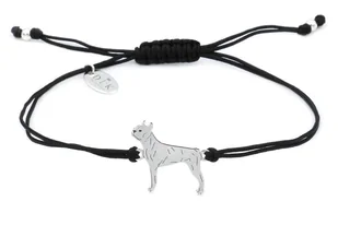 Bransoletka z Boston terrierem to propozycja wyjątkowej biżuterii na rękę z kolekcji “Rasy psów” dla wszystkich miłośników czworonogów. Bransoletka wykonana jest z łącznika w kształcie sylwetki psa ze srebra (próba 925) oraz z czarnego sznurka. Bransoletkę sznurkową dodatkowo ozdabiają srebrne elementy – kulki i zawieszka DLK z czystego srebra (próba 925). Rozmiar psa: 16 x 15 mm Surowiec: