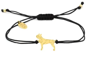 Bransoletka z psem Boston terrierem to propozycja wyjątkowej biżuterii na rękę z kolekcji “Rasy psów” dla wszystkich miłośników czworonogów. Bransoletka wykonana jest z łącznika w kształcie sylwetki psa z pozłacanego srebra (próba 925) oraz z czarnego sznurka. Bransoletkę sznurkową dodatkowo ozdabiają pozłacane, srebrne elementy – kulki i zawieszka DLK z czystego srebra (próba 925). Rozmiar psa: 16 x 15 mm Surowiec:
