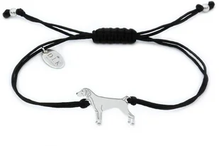 Bransoletka z psem wyżłem srebrnym to propozycja wyjątkowej biżuterii na rękę z kolekcji “Rasy psów” dla wszystkich miłośników czworonogów. Bransoletka wykonana jest z łącznika w kształcie sylwetki psa ze srebra (próba 925) oraz z czarnego sznurka. Bransoletkę sznurkową dodatkowo ozdabiają srebrne elementy – kulki i zawieszka DLK z czystego srebra (próba 925). Rozmiar psa: 19 x 13 mm Surowiec: