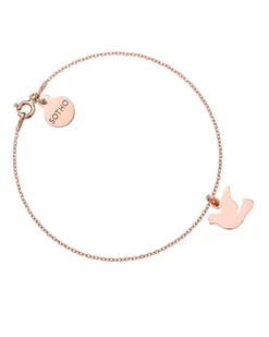 Złota bransoletka łańcuszkowa zdobiona gołębiem i zawieszką z logo marki. Całość wykonana ze srebra 925 powlekanego 24 karatowym różowym złotem. Długość bran...